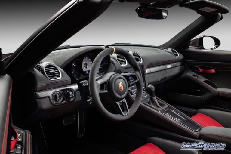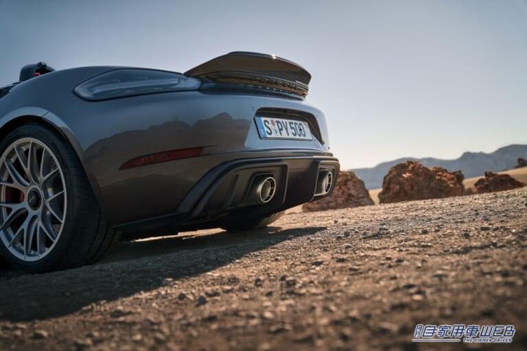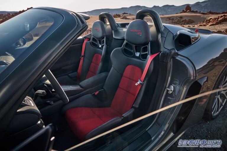 また、エンジンのパワーアップに加え、軽量化もパフォーマンスの向上に貢献している。718スパイダーRSの車両重量は1,410kgで、PDK搭載の718スパイダーより40kg軽く、クローズドモデルの718ケイマンGT4 RSと比較しても5kg軽い。