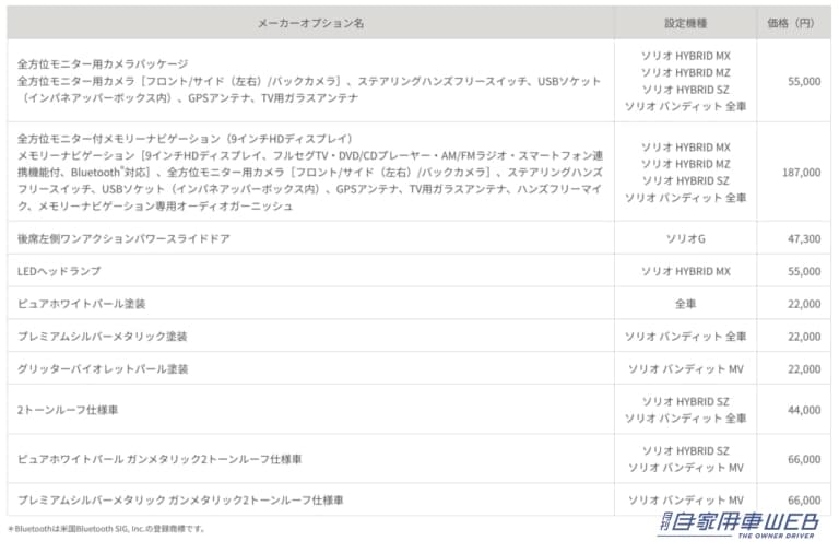 今回の一部仕様変更では、車線を逸脱しそうになった際にドライバーのステアリング操作を支援する車線逸脱抑制機能(LDP)を採用。パワースライドドア予約ロック機能にリクエストスイッチ連動機能を追加。さらにソリオ バンディットでは、後席両側ワンアクションパワースライドドアを全車に標準装備とするなど、装備を充実させた。