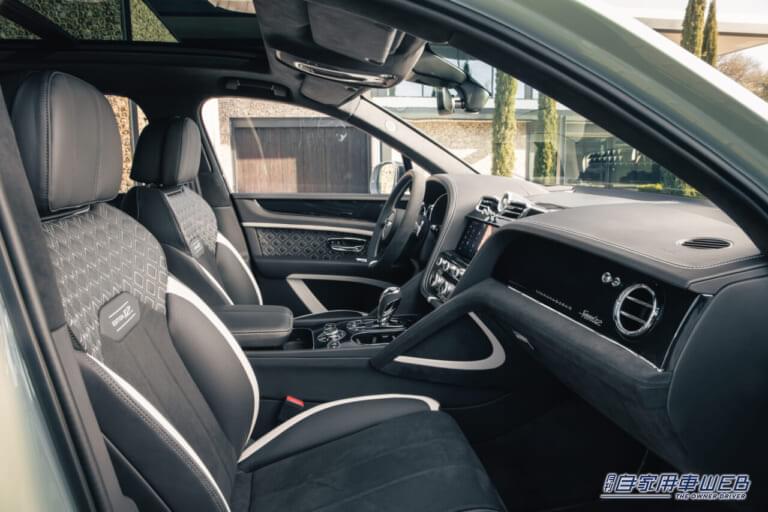 この限定車ならではの特徴として、シートにはマリナーシルバーのパイピングとエディション12の刺繍が施されている。また、シート上部はキルティング加工され、アンスラサイトからポーポイズ、ストラトスへグラデーションとなるコントラストステッチも見られる。ドアパネルはキルティング加工され、コントラストステッチとなっている。いずれも手作業で作られた個性的なインテリアだ。
