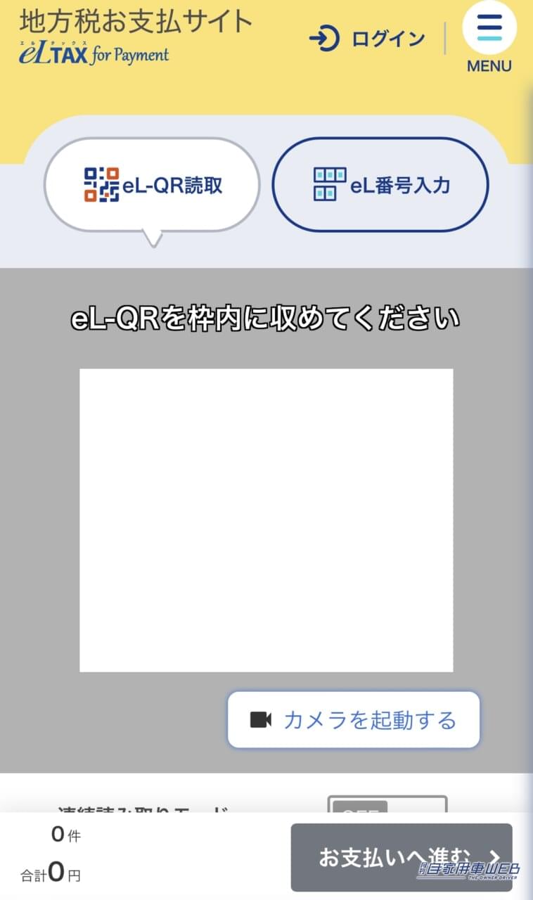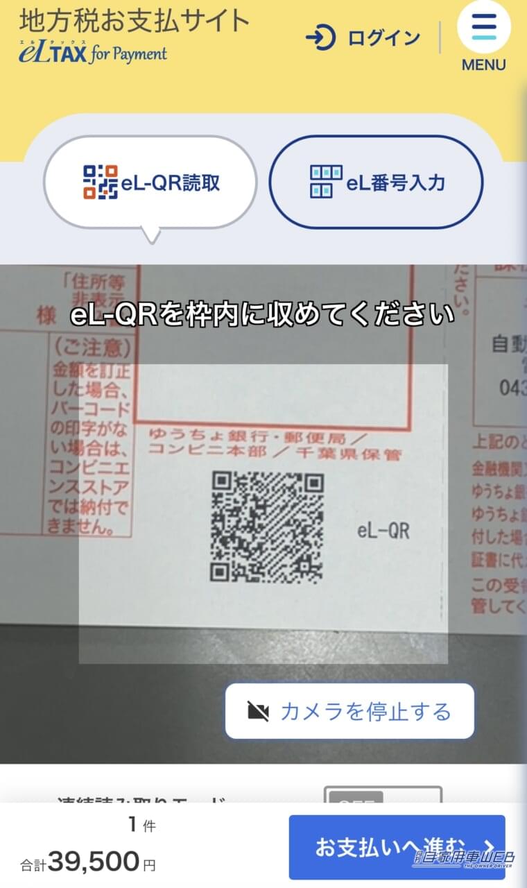 通知書に記載されているQRコードのうち、右に「eL-QR」と記載があるものが支払いに使えるもの。これを読み取ると画面下部に金額とともに【お支払いへ進む】が表示されるのでこちらをタップ。