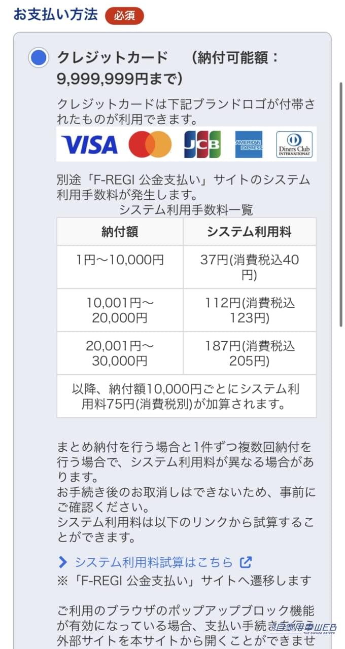 【クレジットカード】を選択すると、システム利用料についての説明が表示される。
