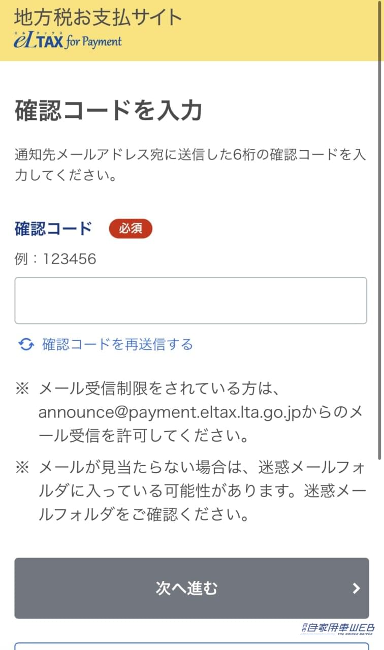 すると上記の画面が表示される。入力したメールアドレスに、[eLTAX 地方税お支払いサイト]から6桁の確認コードが届くので、そちらを入力して【次へ進む】をタップ。