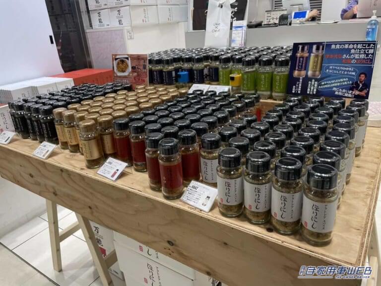 お店に入り、まず目に飛び込んでくるのは、ほりにし6種がズラリと並んだこちらのテーブル。オリジナルの「ほりにし」はもちろん、調味料選手権で1位を獲得した「ほりにし ブラック」や、津本式とコラボしたものも揃っている。ではそれぞれを簡単にご紹介。