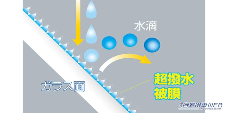 2011年にフロントガラス用に独自開発された超撥水技術。微細な突起の撥水被膜を形成することで、フロントガラスの水滴を弾き、視界がクリアになる。通常の撥水剤は、走行することにより風圧で水滴が流れてしまうが、『ゼロワイパー』は停車中でも水がフロントガラスにつかない。