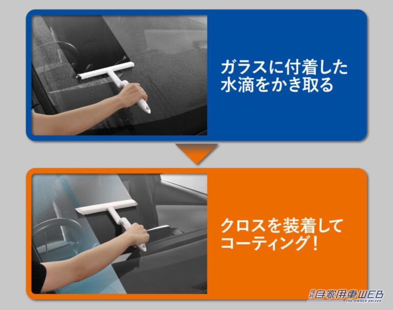 ツールもエントリーユーザー向けにシンプルにし、水滴のかき取りに使ったワイパーをそのままコーティング液施工に利用できるほか、撥水コート処理ガラスおよび未処理ガラスにも対応している。