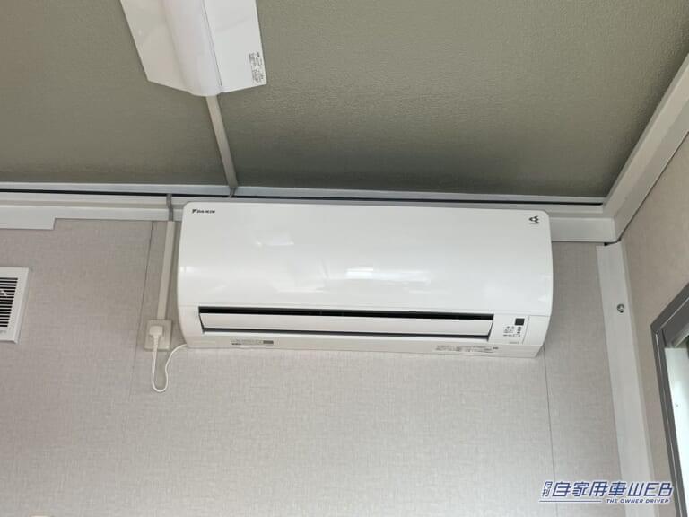 しっかりと足を伸ばして寝られるベッドスペース。落下防止の柵もあるので安心。エアコン(オプション)は一般的な住宅用のものが設置されているので非常に強力。