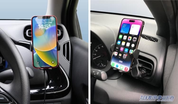 ネジ固定式クリップでしっかりエアコンフィンに固定できる。360度回転するスイングアームで、見やすく、エアコンをふさがない位置への移動も可能。スマホの縦置き、横置きにも対応している。