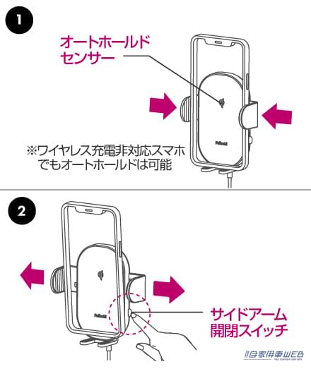 スマホを置くとアームが閉まるオートホールド機構を搭載。スマホを置くとオートホールドセンサーが反応しオートホールド。サイドアーム開閉スイッチを押すとサイドアームが開き、スマホを取外すことができる。キャパシタ(蓄電装置)を内蔵しているので、エンジン停止後も1~2回アームの開閉操作が可能だ。