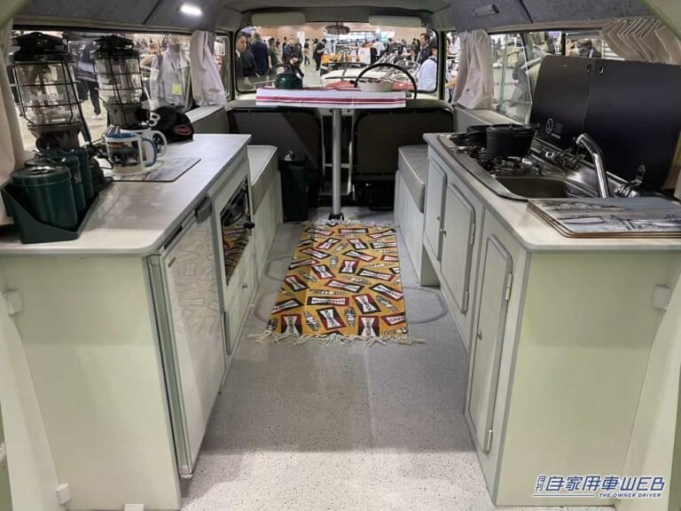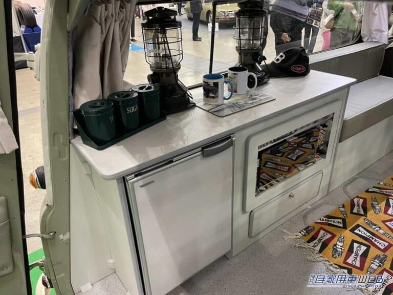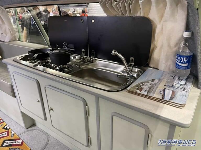 キッチン部分右にはガスコンロとシンクが備えてある、蓋をすればフラットなテーブルになるので、車内スペースを有効に使うことができる。左は冷蔵庫とオーブンが、設置されている。