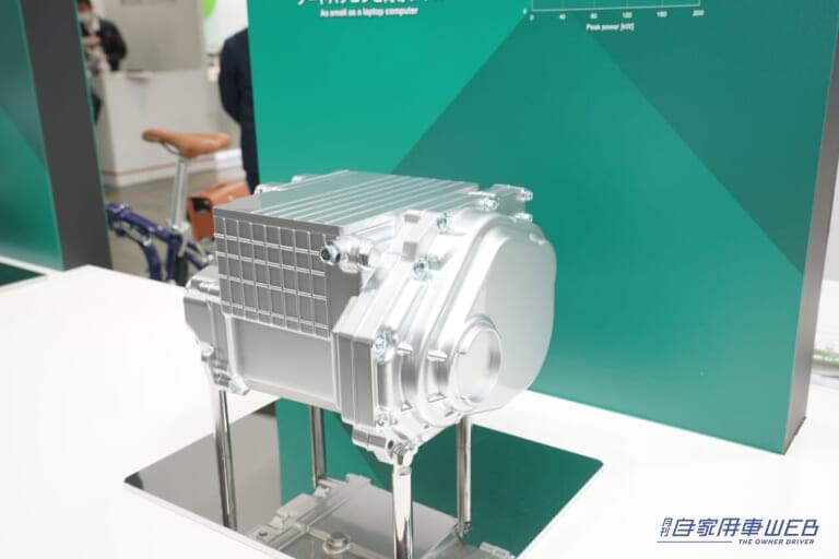 軽自動車から小型車クラスを想定して開発研究しているe-Axle(平行軸)を初公開。高回転モーターと小型ギアを組み合わせることで小型化を達成。15インチのノートパソコンと同等サイズに抑えることに成功している。マックスパワーは60kW。
