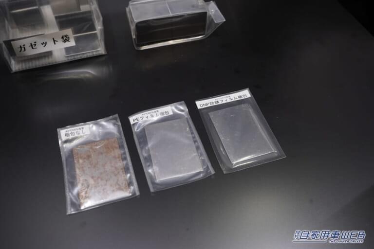左がフィルム無し、中が他メーカーの汎用フィルム、右がDNPの防錆フィルムの施工サンプル。湿度90%、温度40℃で保管した場合だと、DNPの防錆フィルムを施工した鉄板が優れていることがすぐに分かる。