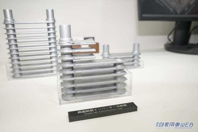 ハイブリッド車や電気自動車の電力を適切にコントロールするパワーコントロールユニット(PCU)。その内部に配置される直流電流と交流電流を相互に変換するインバーターを冷却するのが冷却器の役割になる。今回展示されていた両面積層インバーター冷却器は、インバーターの大出力化に伴う高熱化に対応するため、冷却性能を大幅に向上させた新タイプとなる。