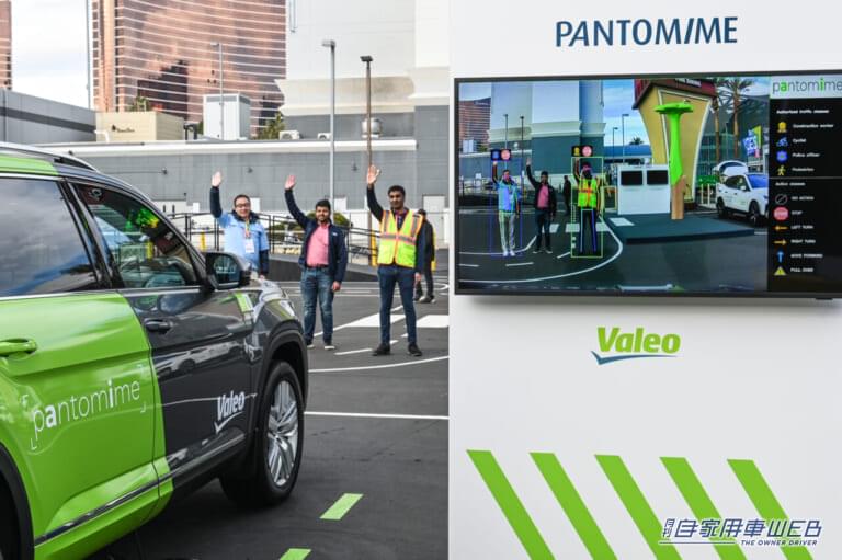 カメラ映像を解析することで、特定の人物の動きを検知する「パントマイム」技術をデモンストレーション。安全ベストをAI(人工頭脳)が検知認識することで、工事現場での交通整理の動作を理解し、より正確な自動運転を可能とするという。サイクリストなどの交通弱者の動きも予測し検知認識させることも可能とのこと。