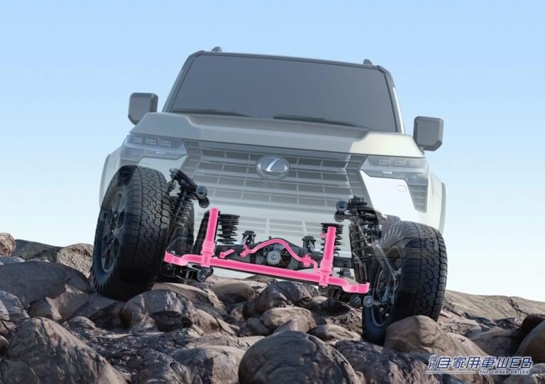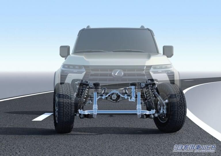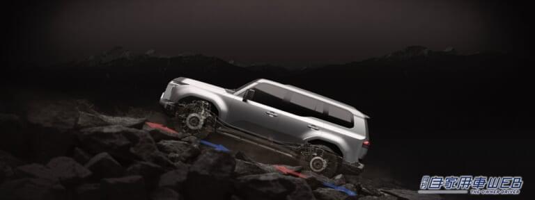 さらに岩石路やモーグル路などにおける路面追従性を向上させるレクサス初採用の「E-KDSS」や5段階の速度設定に合わせて、駆動力とブレーキ油圧を自動で制御し、ステアリング操作のみで極低速走行が可能な「クロールコントロール」、オフロード走行支援を、従来の5つのモードから、6つのモード(AUTO/DIRT/SAND/MUD/DEEP SNOW/ROCK)へ拡充した「マルチテレインセレクト」を採用する。