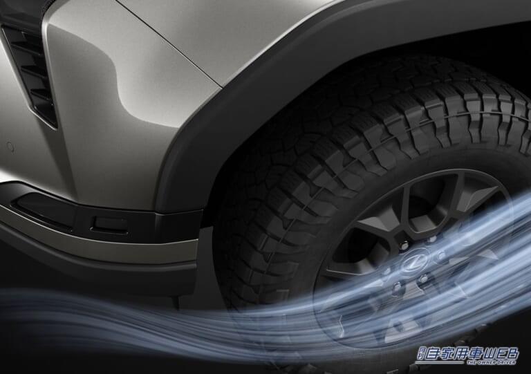 走行性能もさまざまな機能を追加して悪路走破性を高めており、標準仕様を凌駕する内容となっている。まずは、タイヤメーカーと共同開発した、オンロードとオフロードの理想的な走行性能バランスを確保した専用の265/70R 18のオールテレーンタイヤだ。サイドウォールには泥濘路などにおける脱出性向上などの機能とタフな印象を持たせたトレッドパターンを採用。空力性能に影響のあるショルダー形状も最適化され、風の流れをコントロールし、燃費性能にも寄与する。