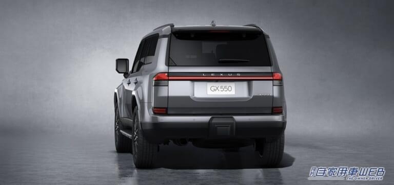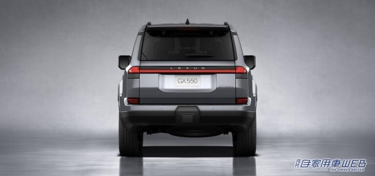 リヤビューは、まるで削りだしのインゴットのようなフォルムを採用。安定感あるスタンスとモダンなフォルムを実現している。ここ最近のレクサス車と同じく、新たなアイコンである一文字リヤコンビネーションランプとLEXUSロゴを採用した。また、リヤコンビネーションランプが高く配置されており、林間や見通しの悪い場所での隊列走行時に、自車の存在を周囲へ知らせる役割を果たすという。