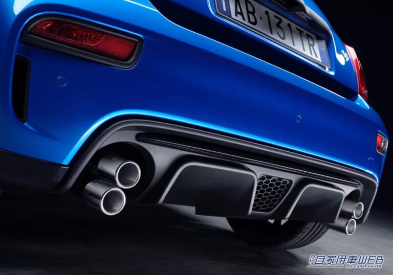 エクステリアには、「131 Rally」をイメージした青のボディカラー「 Nero Scorpione/Blu Rally」を採用。フェンダーアーチは片側5mmずつ拡幅され、「131 Rally」のワイドフェンダーを彷彿させるもとなっている。さらにモータースポーツにインスピレーションを得たサイドスカート、12段階に角度調整が可能なアジャスタブルリアスポイラーも装備される。