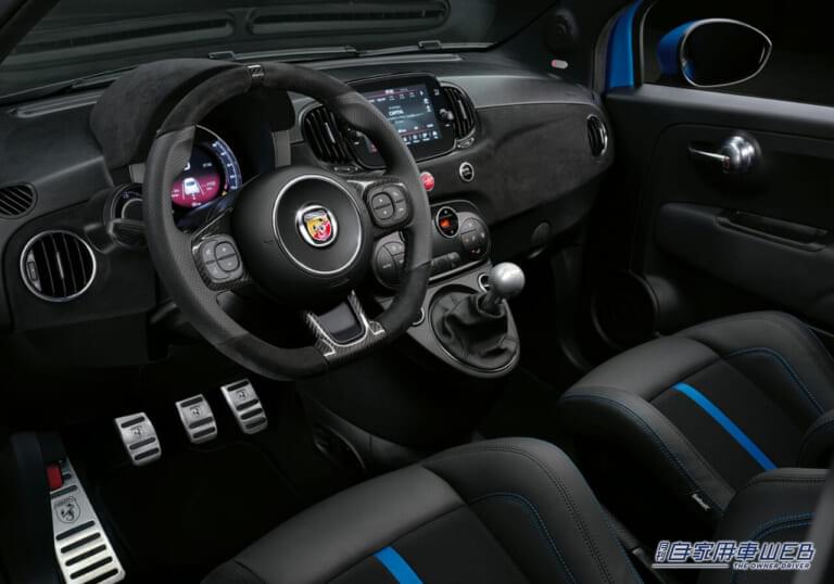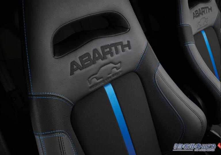 ルーフやリップスポイラー、フェンダーアーチ、サイドスカートをブラック仕上げとしたビコローレ(2トーンカラー)を採用。ボディサイドには、専用ロゴ入りABARTHサイドストライプが貼られる。加えて、ダイヤモンド仕上げの17インチアルミホイールやブラック仕上げのブレンボ製4ポッドフロントブレーキキャリパーも装着。高性能エキゾーストシステム「レコードモンツァ」は、片側2本ずつのエキゾーストパイプを上下に配置した特別なレイアウトとなる。
