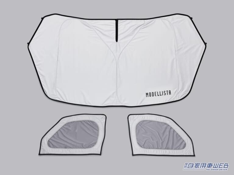専用設計のウインドシールドガラス、運転席・助手席のフロントドアガラス用サンシェード。使用しない時はコンパクトに収納可能です。専用ケース付き。