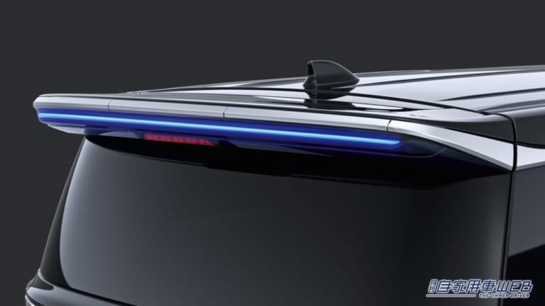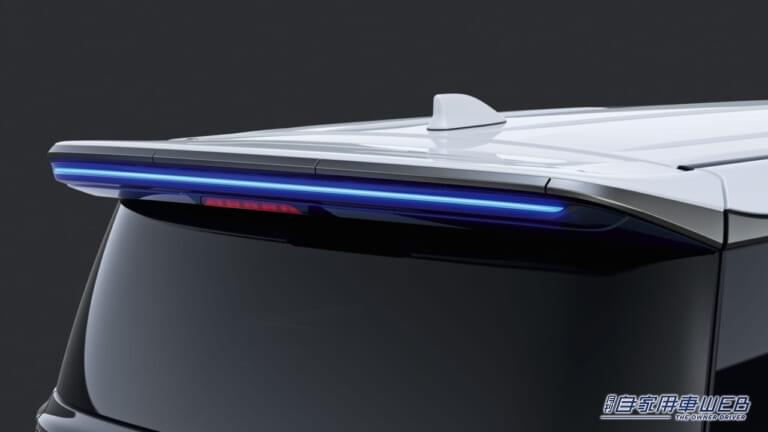 車両サイドのウインドーモールから連続感を持たせたメッキ加飾と、ライン発光するブルーのLEDが際立つイルミルーフスポイラー。リヤビューに先進感と上質感を付加します。