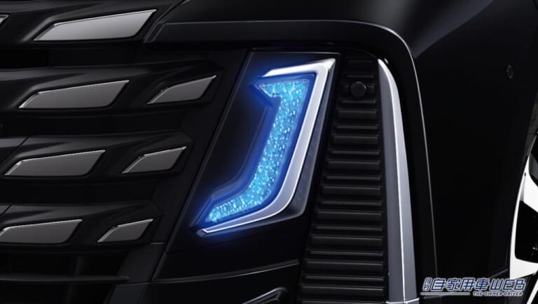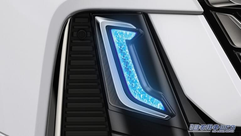 グリルサイド部にレイアウトされたコの字形状のメッキパーツとブルーのイルミネーションが、先進的な煌びやかさと高級感ある佇まいを演出します。