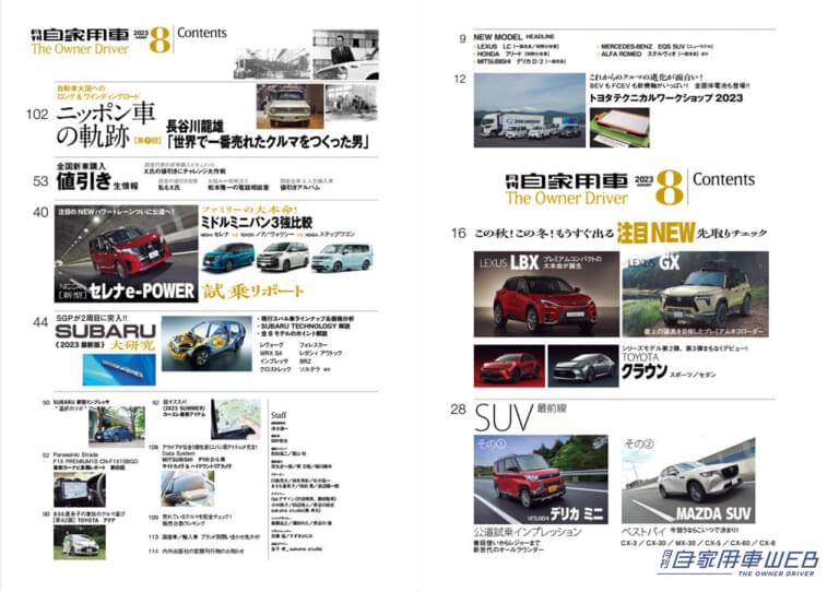 月刊自家用車8月号(6/26発売)では、2023年秋冬に発売が予定される注目車種を先取りチェック!シリーズモデル第2弾、第3弾がまもなくデビューするトヨタのクラウンスポーツ/セダンも紹介する。ファミリーの大本命となる日産セレナ、トヨタ ノア/ヴォクシー、ホンダ ステップワゴンなどミドルミニバン3強比較も見逃せない。その他、2023 SUMMERカーエレ特集やX氏の値引き情報など、企画盛り沢山で絶賛発売中。
