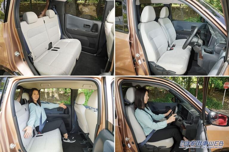 座り心地のいいベンチタイプの前席はソファ感覚。後席は前後スライドに加えてリクライニングもできて快適!