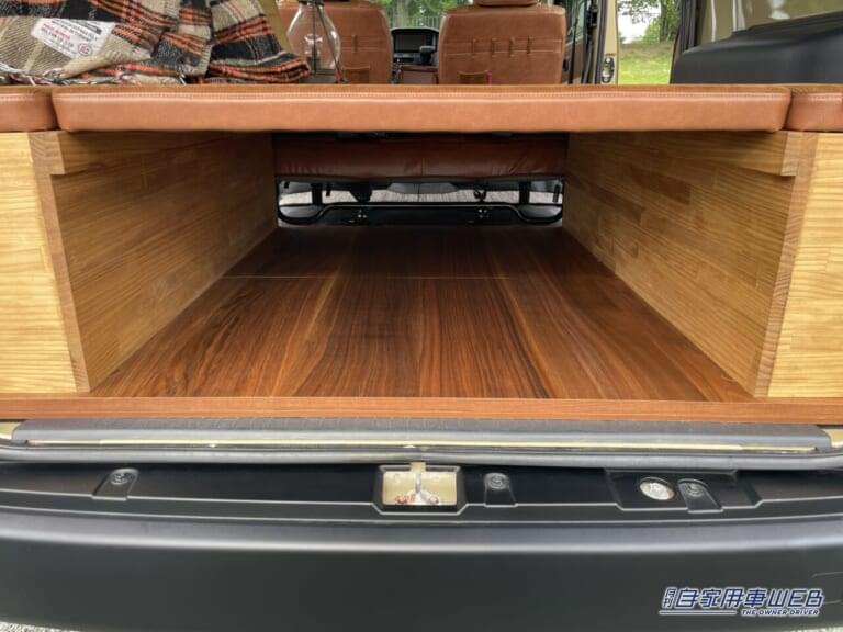荷室は2段になっており、上段はコーデュロイ生地を使用したシート、下段は木目を活かした収納スペースとなっている。