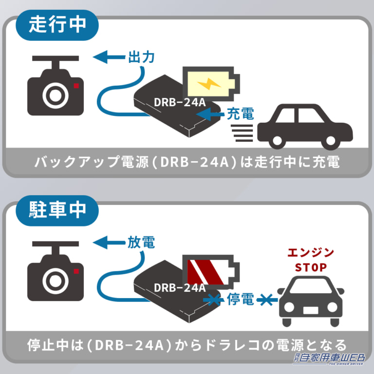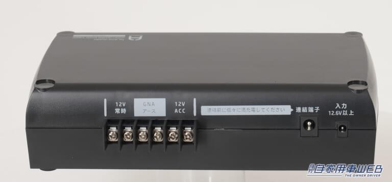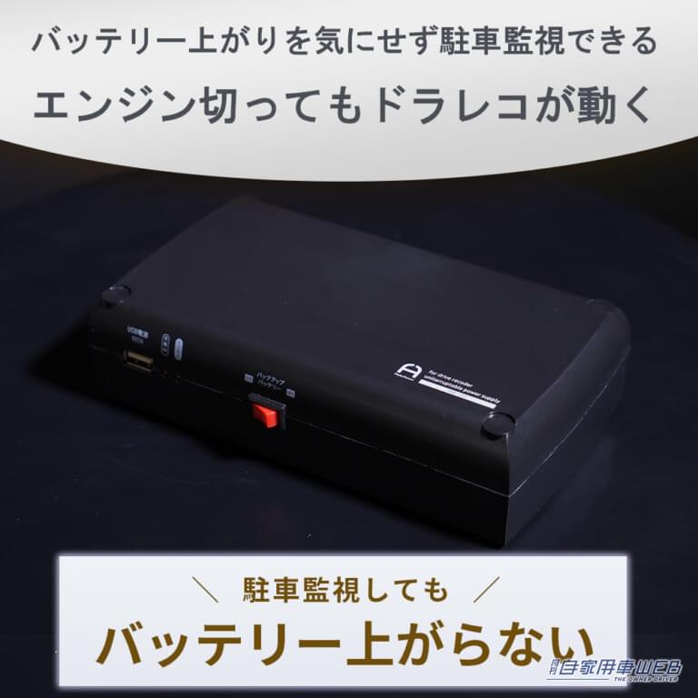 単なるバッテリーではなく、いわゆるUPS、無停電電源装置の方式を採用。エンジンを切った瞬間に一瞬たりとも電圧を下げないよう、ドライブレコーダー側から見ると常に安定した電圧を出力し続ける。