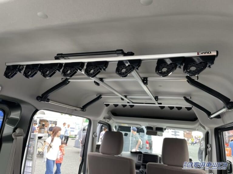 天井にはinnoのロッドホルダーを設置。8本の釣り竿を固定することができる。上段のシートも広く、大人1人が寝るには十分なスペースのため、夜討ち朝駆けが常の釣り人にとっては、車中泊するにも快適だ。