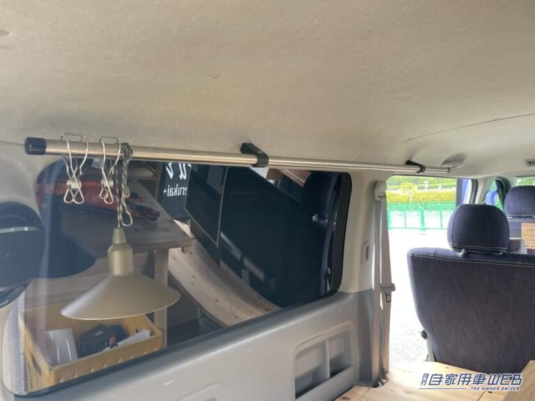 サイドバーも設置されており、衣類やキャンプ道具などを掛けることが可能。また、ベンチの中は収納スペースとなっており、収納力も申し分ない。