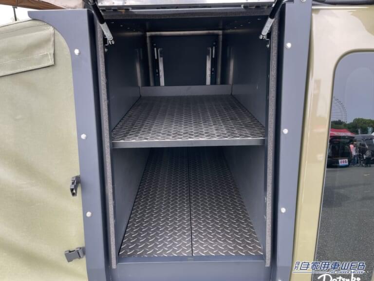 ボックス内部は2段になっており想像以上に多くの荷物が詰め込める。タープで覆われた荷台部分のスペースもかなり広く、軽トラックの積載量を存分に活かした作りとなっている。