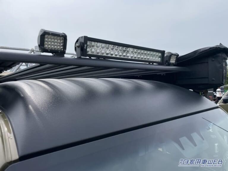 カーキとブラックで統一されたボディカラーは、ミリタリー風の印象を与え、アウトドアにぴったりな仕上がり。フロントにはバンパーを装備し、フロントガラス上にはLEDライトも備えている。