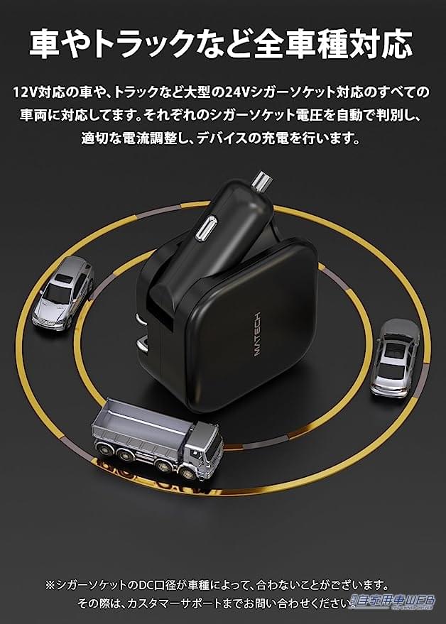 普通自動車(12V)から大型トラック(24V)まで幅広い車種のシガーソケット入力に対応している。ほぼ全てのシガーソケット装備車で使用可能だ。