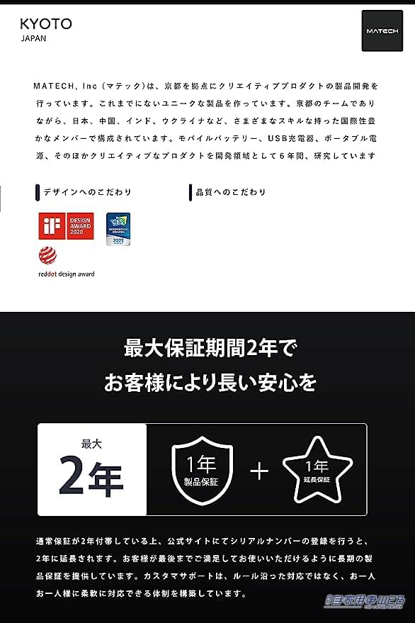 本製品は、通常保証1年が購入日より適用され、保証対象となる。また、購入後に公式サイトにて製品登録を行うと、+1年の延長保証が付く。