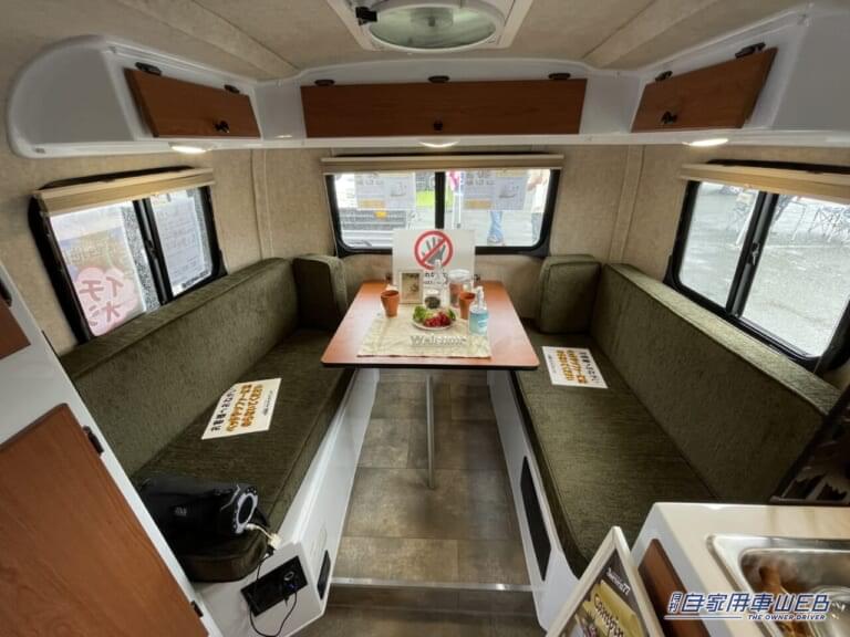 室内はソファー、テーブル、キッチンが設置されたシンプルな作り。外観からは想像できない広さだ。