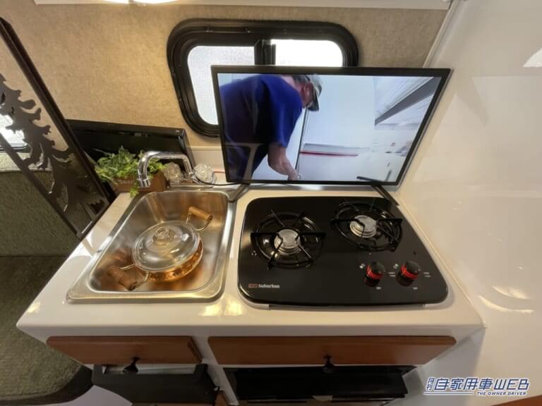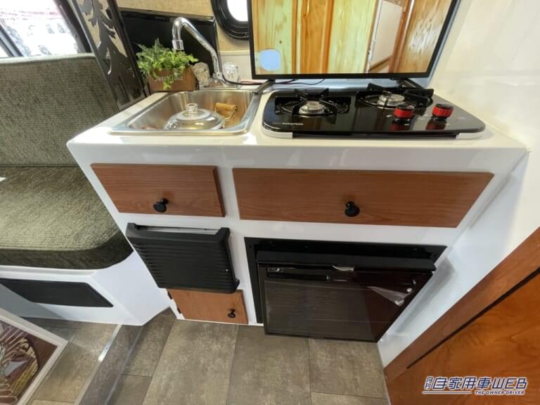 使いやすいサイズのシンクに2つのコンロは、ワンルームのキッチンのよう。下には冷蔵庫もあり、必要な装備がまとまっている。