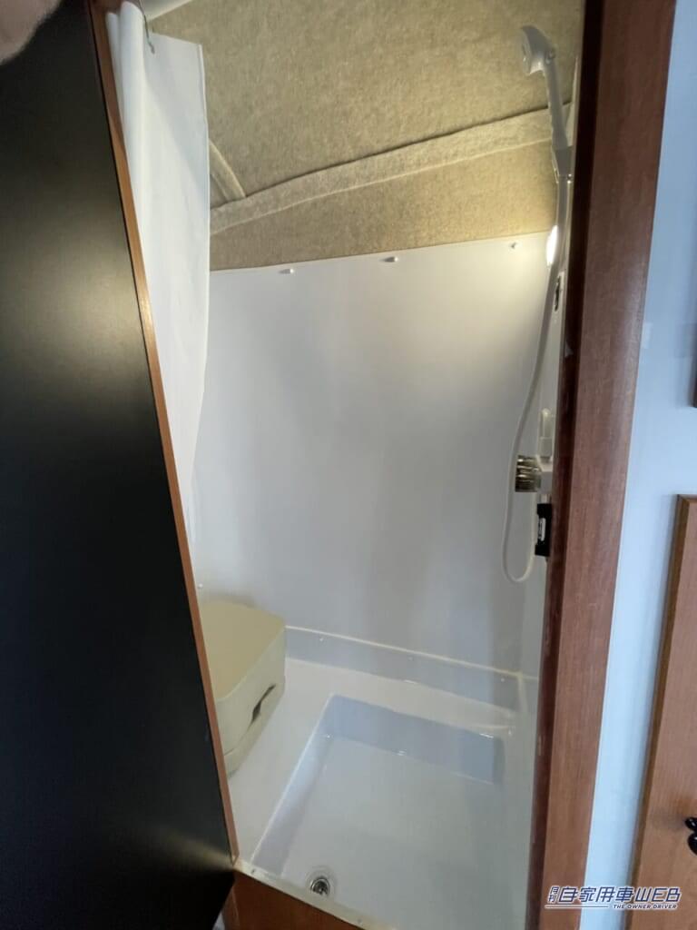 シャワーとトイレは一体型で、トレーラーに入ってすぐ右側に。シャワールームとしては快適に使える広さを確保している。