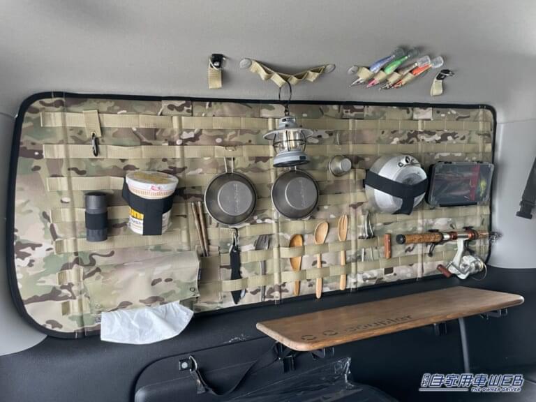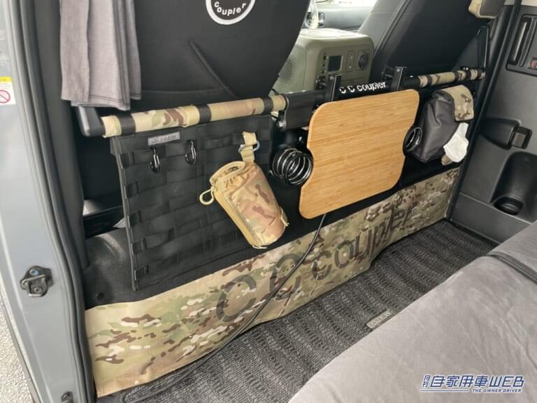 シートの向かいには、開閉可能なテーブルと、モールと呼ばれるループが設けられた布を設置。そのループにカラビナなどを通すことで、様々なものを吊り下げられる仕組みだ。シートにも迷彩柄とグレーを組み合わせたシートが付けられていた。