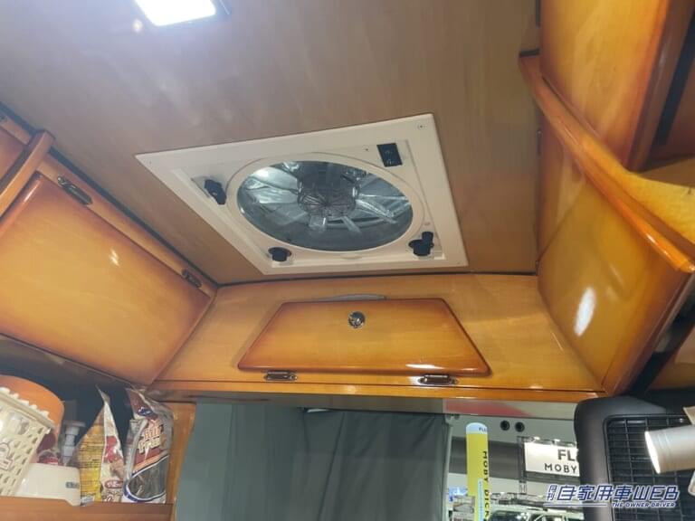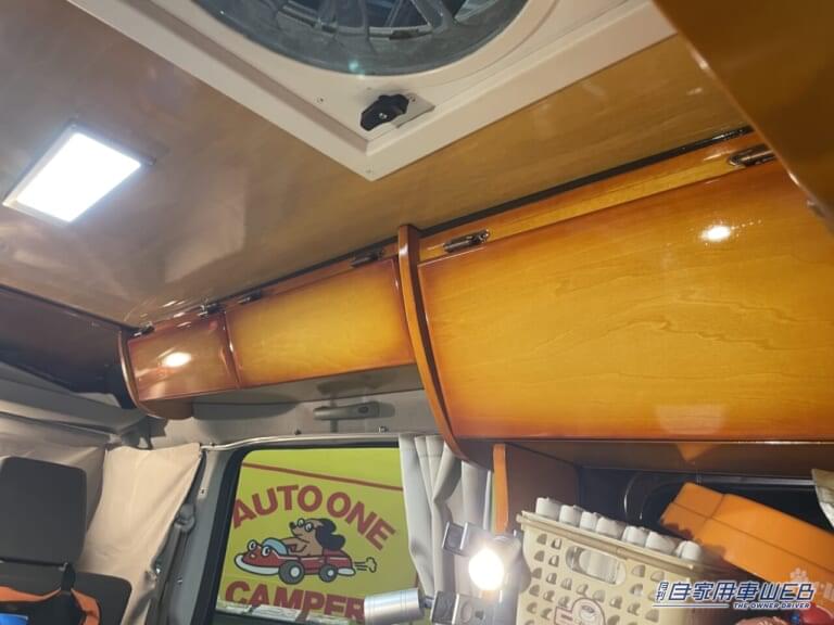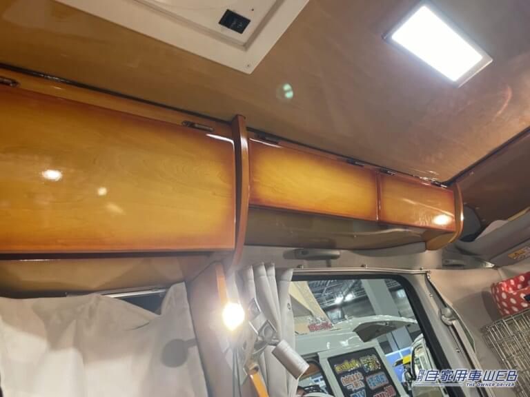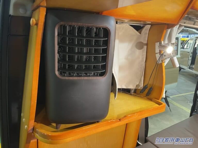 車内の側面にはエアコンと収納棚が設置されている。高さを確保したり、ペットボトルが動かないよう工夫された棚は、愛犬家にとって嬉しい仕様。