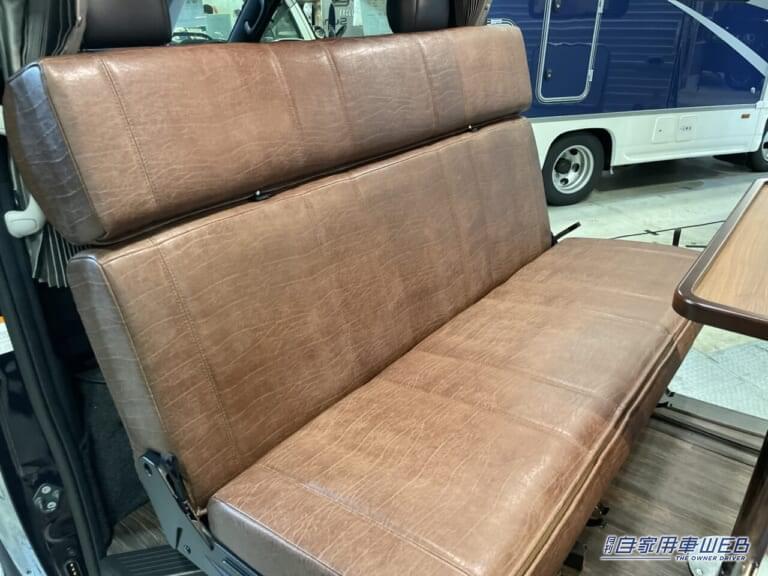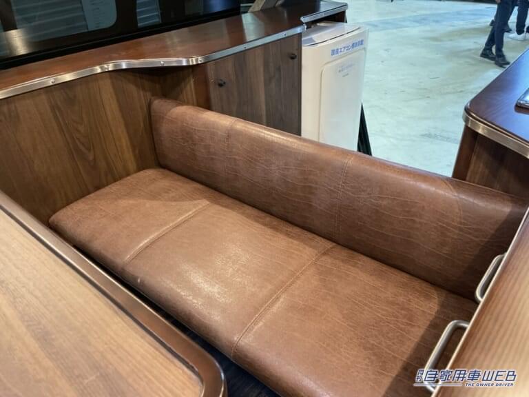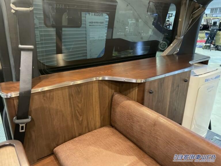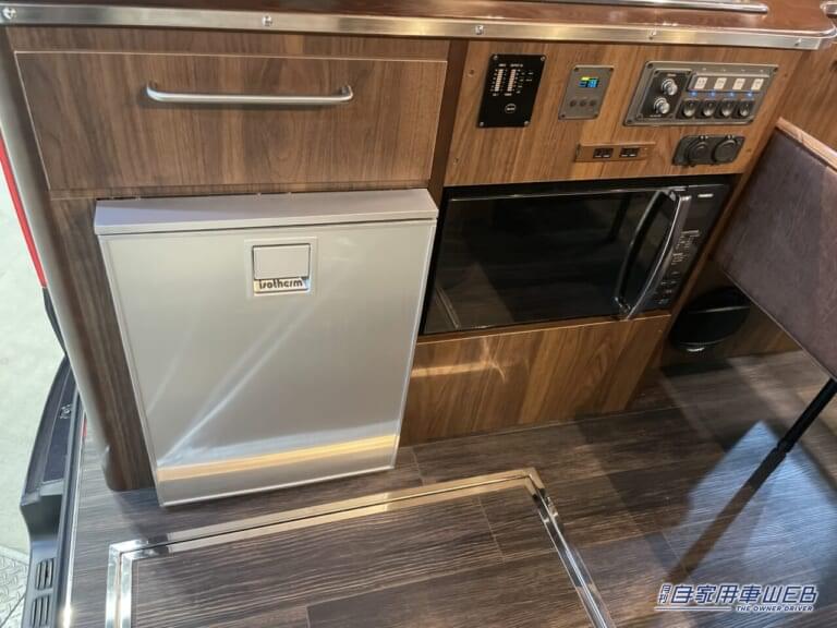 冷蔵庫、電子レンジ、シンクと、必要なキッチン装備は後部左側の壁面にまとまっている。電気系統のスイッチも集約されているので便利だ。反対側はエアコンが設置されており、広々とした空間でもすぐに快適な温度に調整できる。