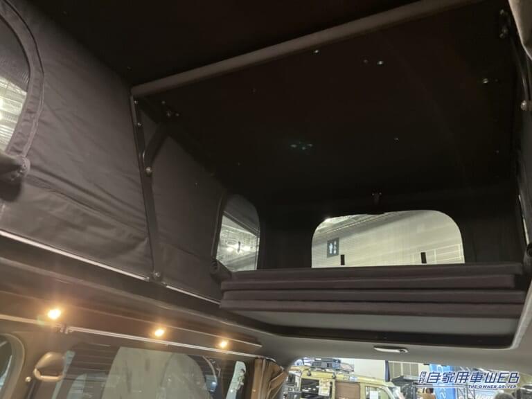 また、ルーフテントも備えており、大人2名が就寝できるスペースが確保されている。もちろん、室内空間を広げることにも一役買っており、展開すると天井が高くなり高身長の人が乗車しても、窮屈さは感じない。