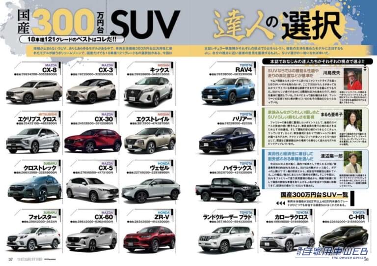 増殖が止まらないSUV。ありとあらゆるモデルがある中で、車両本体価格300万円台は汎用性に優れたモデルが揃うボリュームゾーンで、国産だけでも18車種121グレードもの選択がある。今回は月刊自家用車本誌レギュラー執筆陣がそれぞれの視点で5台をセレクト。複数の支持を集めたモデルに注目するもよし、自分の視点に近い選者の意見を重視するもよし。SUV選びの一助になれば幸いだ。