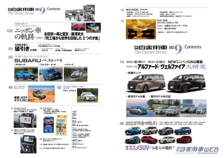 月刊自家用車9月号(7/26発売)では、なんと言っても4代目アルファード・ヴェルファイア大研究。高級サルーンとしてどのように進化してきたのか?新旧モデル比較により徹底解説する。また、世界中で愛され続ける偉大なオフローダーブランド”ジープ”の小特集も見逃せない。ラングラーやグランドチェロキーなどロングセラーモデルから、スモールSUVとして人気のレネゲードなどを紹介する。その他、2023 細心カーナビ大全やX氏の値引き情報など、企画盛り沢山で絶賛発売中。