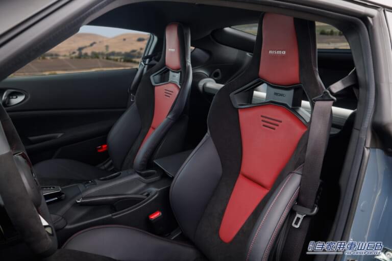 シートには本革とアルカンターラのコンビネーションで仕上げられたレカロシートを採用。センター部分にはレッド、ヘッドレストには「NISMO」ロゴが配される。ステアリングホイールには、本革とアルカンターラのトリムが施されており、12時位置にはレーシングをイメージしたスポーティなレッドのアクセントマークが配されている。