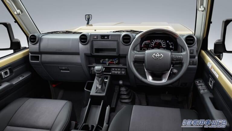 インテリアデザインは、70系そのものでエアコンもマニュアル。プッシュエンジンスタートボタンも無く、エンジン始動は物理キーで行う。ただ、センターパネルにはUSB-Cの充電口が設けられるなど、細かいところは近代化されている。加えて、エクステリアではヘッドランプが丸型になりLEDが採用されている。さらに、近代化と言えば安全装備だ。この再々導入となる「ランドクルーザー”70″」は最新型ではないがACC(アダプティブクルーズコントロール)を含むトヨタセーフティセンスを搭載する。