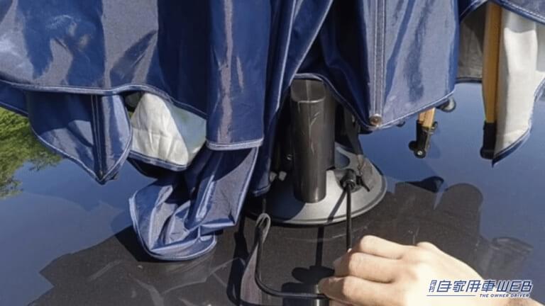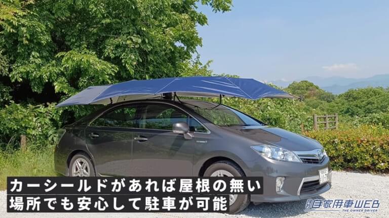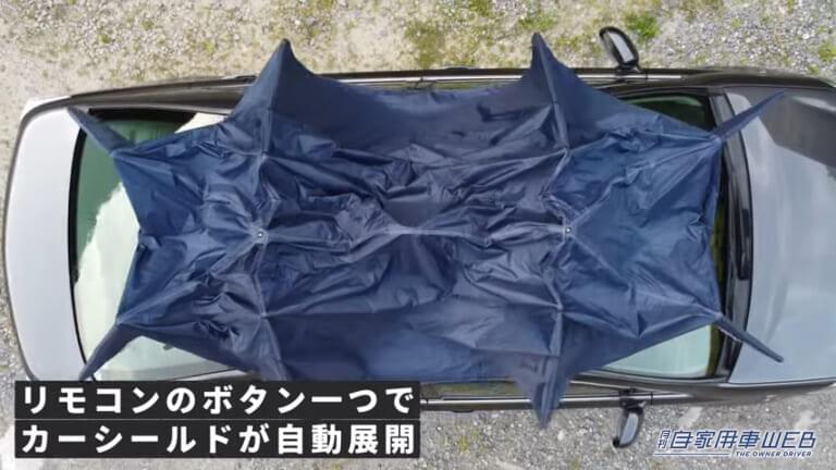 合同会社NWO JAPANはパラソル型のカーシールドをクラウドファンディングサイト〈Makuake〉にて購入応援を受け付けている。