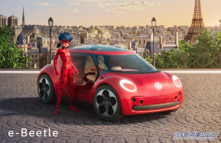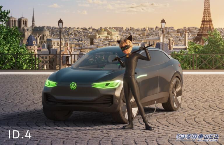 主人公のレディバグはザ・ビートルのコンセプトカー「e-Beetle」、シャノワールは日本でも発売中のフル電動SUV「ID.4」に。