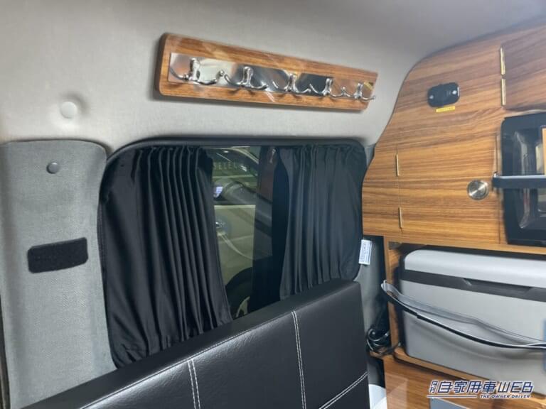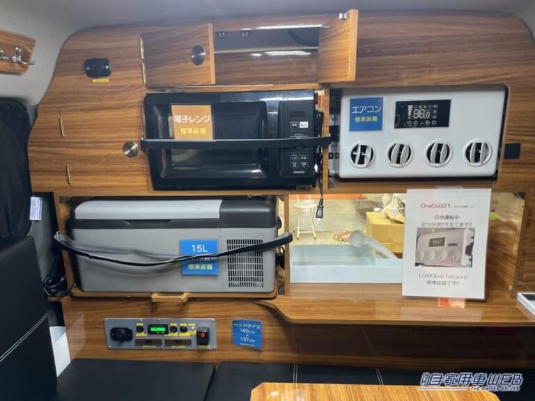 電子レンジ、冷蔵庫、エアコン、シンクが後部に集中し、室内空間の確保に貢献するデザインとなっている。スイッチ系統もこちらにまとまっており使いやすい。空いたスペースは収納棚となり、一切無駄がない配置だ。