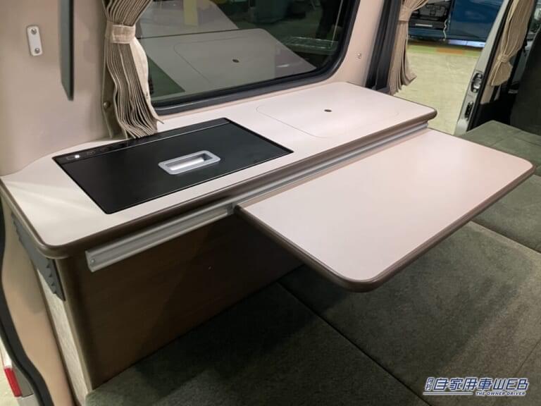 後方にはフリップダウンモニターを設置している。使用しないときは折り畳めるので邪魔にならない。サイドテーブルも収納可能なため必要な場合のみ展開すれば、室内スペースを犠牲にすることはない。